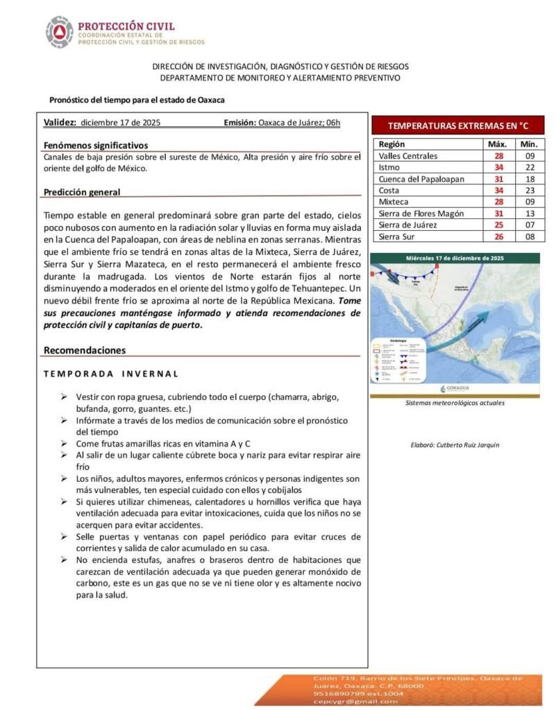 🔴Para este miércoles 17 de diciembre, se prevén condiciones de tiempo estable en gran parte del estado de Oaxaca, con cielos mayormente despejados, aumento en la radiación solar y baja probabilidad de lluvias, informó la Coordinación Estatal de Protección Civil y Gestión de Riesgos (CEPCyGR).